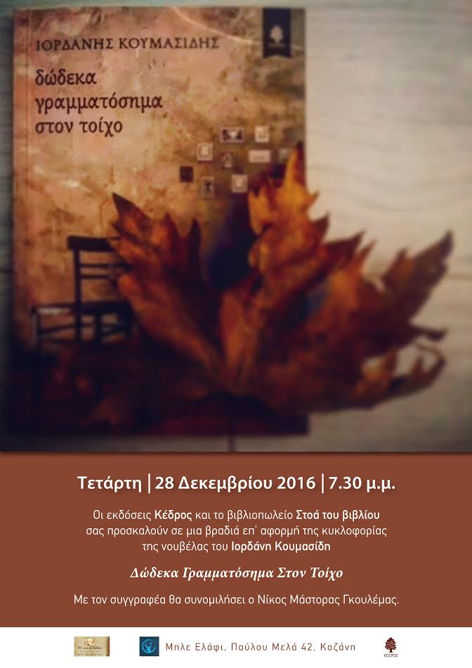 Οι εκδόσεις Κέδρος και το βιβλιοπωλείο Στοά του βιβλίου σας προσκαλούν σε μια βραδιά επ’ αφορμή της κυκλοφορίας της νουβέλας του Ιορδάνη Κουμασίδη Δώδεκα Γραμματόσημα Στον Τοίχο. Με τον συγγραφέα θα συνομιλήσει ο Νίκος Μάστορας Γκουλέμας.