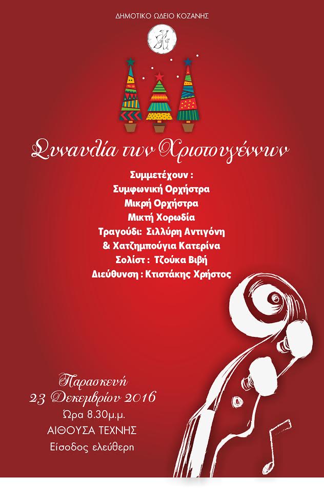Σας προσκαλούμε στην μεγάλη Χριστουγεννιάτικη συναυλία του Δημοτικού Ωδείου Κοζάνης. Συμμετέχουν η Μικρή και Συμφωνική Ορχήστρα του Δ.Ω.Κ. καθώς και η Μικτή Χορωδία. Διευθύνει ο μαέστρος Χρήστος Κτιστάκης.