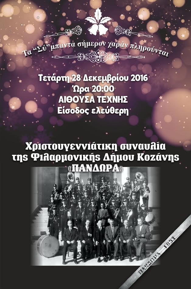 Σας προσκαλούμε στην χριστουγεννιάτικη συναυλία της Φιλαρμονικής Δήμου Κοζάνης “ΠΑΝΔΩΡΑ” με μελωδίες από όλο τον κόσμο, στην Αίθουσα Τέχνης, Τετάρτη 28 Δεκεμβρίου στις 8μ.μ.
