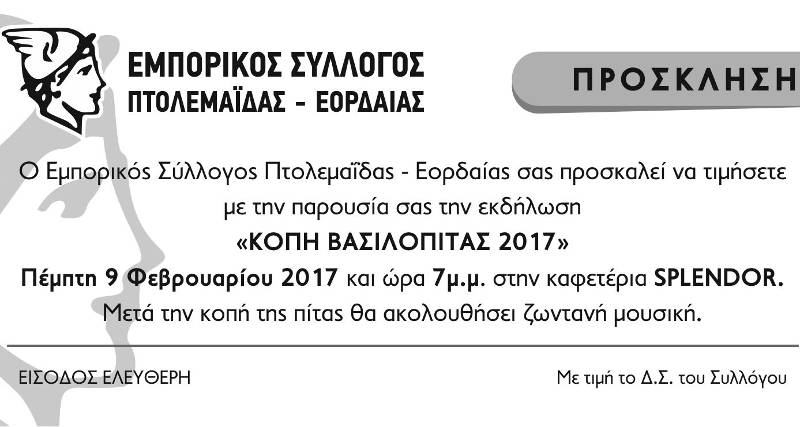Ο Σύνδεσμος Γουνοποιών –Γουνεμπόρων Σιάτιστας προσκαλεί τα μέλη και τους φίλους του στην Κοπή της Βασιλόπιτας, που θα πραγματοποιηθεί την Κυριακή 26/02/2017  και ώρα 11:00 π.μ. στο Ξενοδοχείο «Αρχοντικό» στη Σιάτιστα.