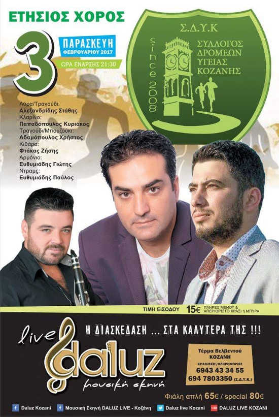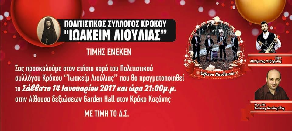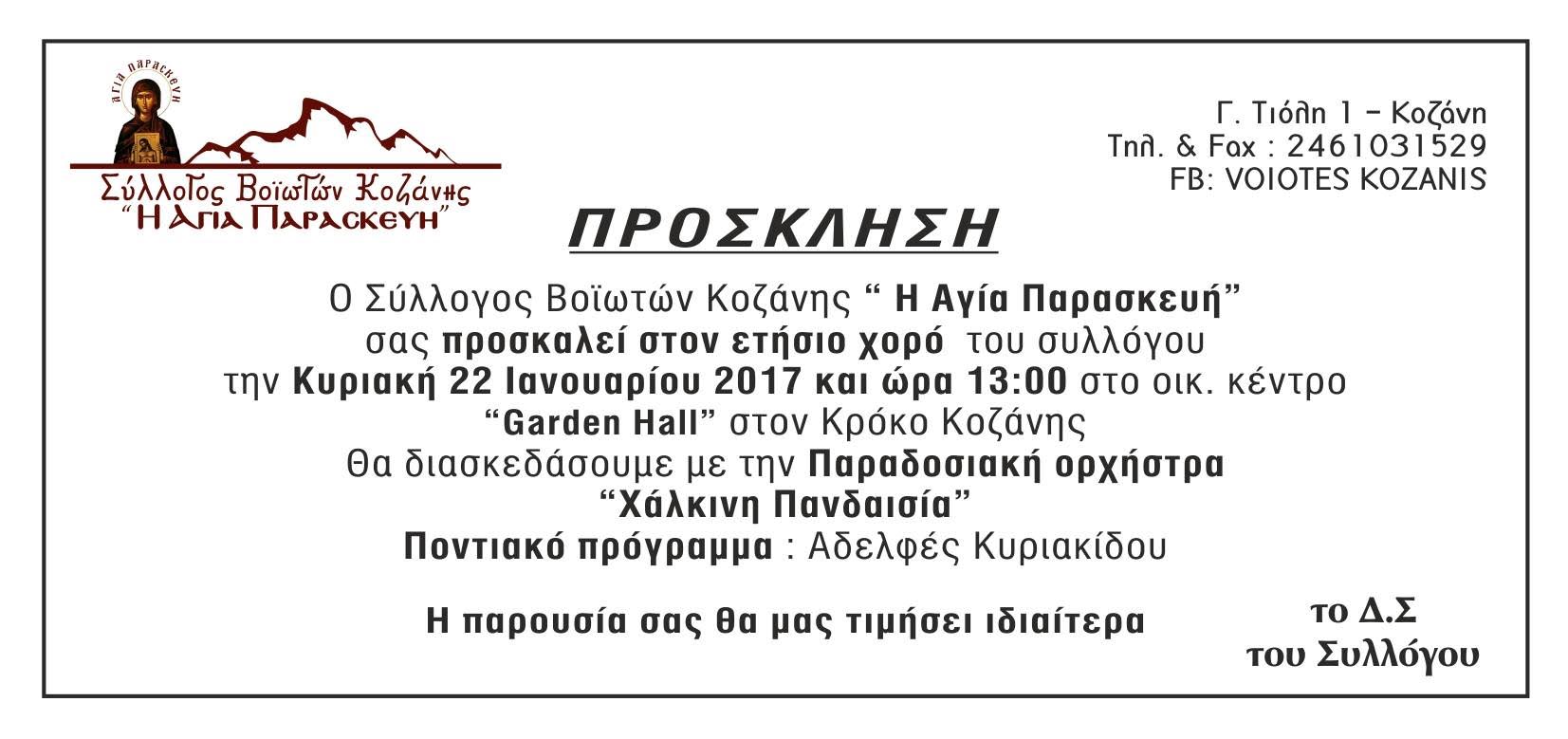 wryws5tui6yws5iujs5rtyidt7yΟ Σύλλογος Βοϊωτών Κοζάνης «Η Αγία Παρασκευή» σας προσκαλεί στον Ετήσιο Χορό του Συλλόγου, την Κυριακή 22 Ιανουαρίου 2017 και ώρα 13:00 (μεσημέρι), στο οικ. Κέντρο «GARDEN HALL» στον Κρόκο Κοζάνης.