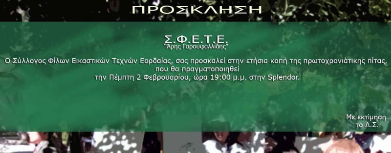 Ο σύλλογος φίλων εικαστικών τεχνών Εοραδαίας “Άρης Γαρουφαλλίδης” σας προσκαλεί στην ετήσια κοπή πρωτοχρονιάτικης πίτας, που θα πραγματοποιηθεί την Πέμπτη 2 Φεβρουαρίου , ώρα 19:00 μ.μ στo cafe Splendor.