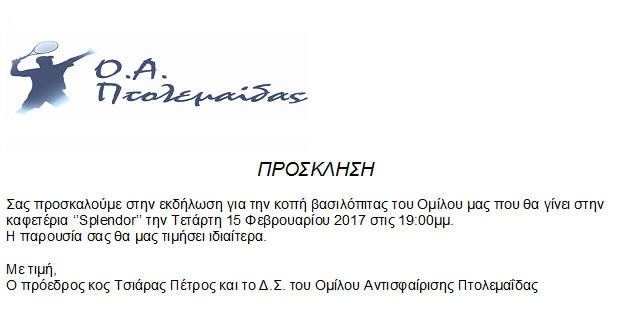 Ο σύλλογος  ΑμεΑ Π.Ε Κοζάνης το Σάββατο 18 Φεβρουαρίου 2017 και ώρα 19.00  μ.μ  θα κόψει την Πρωτοχρονιάτικη Βασιλόπιτα του στην καφετέρια «NATURAL» που βρίσκεται στις εγκαταστάσεις του τέννις, τέρμα διοικητηρίου με γράμμου, οπού μπορούν να παραβρεθούν  τα μέλη και οι φίλοι του συλλόγου μας.