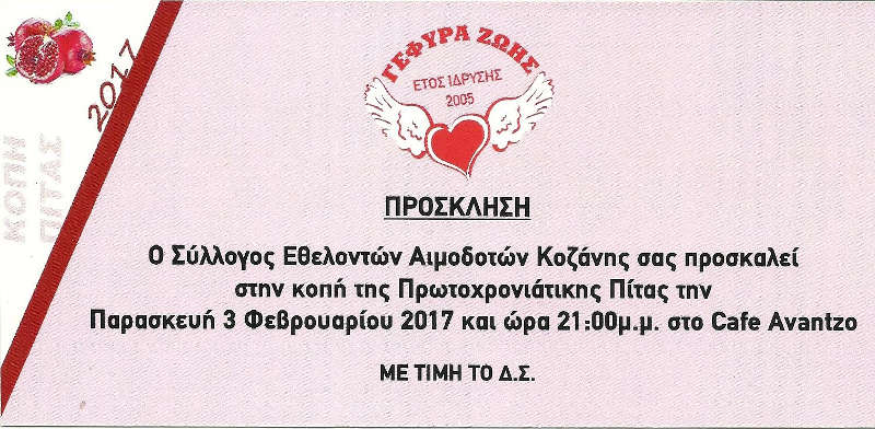Η διοίκηση του Συλλόγου Εθελοντών Αιμοδοτών Κοζάνης «Γέφυρα Ζωής» καλεί τα μέλη και τους φίλους του στην καθιερωμένη κοπή της Βασιλόπιτας, τη Παρασκευή 3 Φεβρουαρίου 2017 στις 21:00, στο Café Avantzo, Ανδρέα Παπανδέου 27, τηλ. 2461029520.