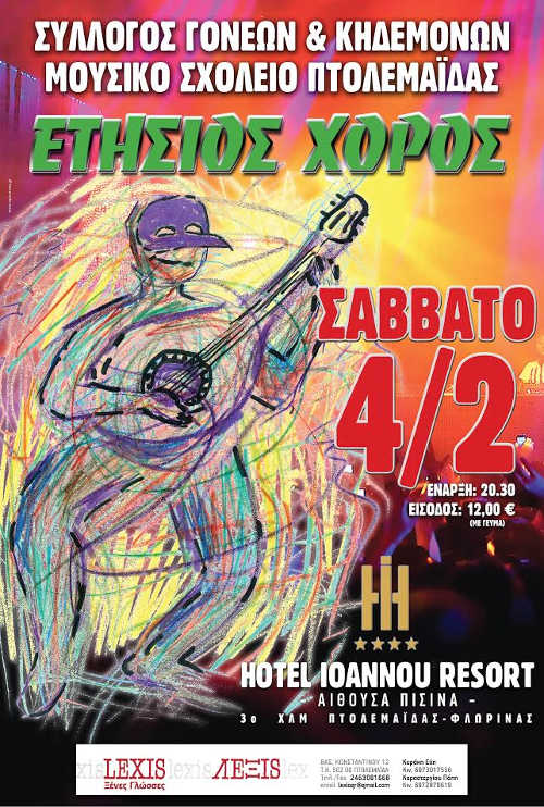 Ο ΣΥΛΛΟΓΟΣ ΓΟΝΕΩΝ ΚΑΙ ΚΗΔΕΜΟΝΩΝ ΤΟΥ ΜΟΥΣΙΚΟΥ ΣΧΟΛΕΙΟΥ ΠΤΟΛΕΜΑΪΔΑΣ ΣΑΣ ΠΡΟΣΚΑΛΕΙ ΣΤΟΝ ΕΤΗΣΙΟ ΧΟΡΟ ΤΟΥ, ΠΟΥ ΘΑ ΠΡΑΓΜΑΤΟΠΟΙΗΘΕΙ ΤΟ ΣΑΒΒΑΤΟ 04 ΦΕΒΡΟΥΑΡΙΟΥ 2017 ΚΑΙ ΩΡΑ 20:30 ΣΤΗΝ ΑΙΘΟΥΣΑ ΠΙΣΙΝΑ ΤΟΥ HOTEL IOANNOU RESORT.