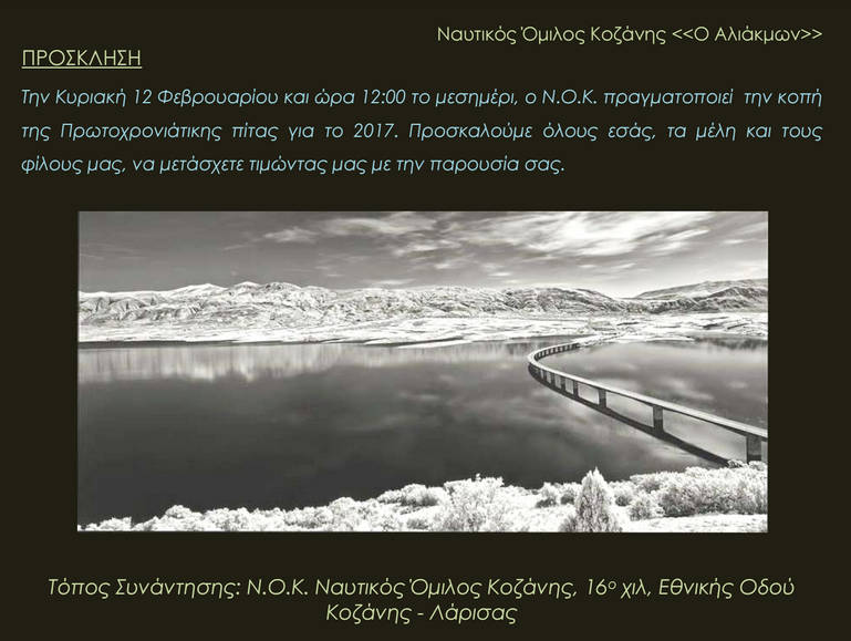 O Ναυτικός  Όμιλος Κοζάνης  «Ο ΑΛΙΑΚΜΩΝ», προσκαλεί τα μέλη και τους φίλους του ομίλου,  στην εκδήλωση για την κοπή της Βασιλόπιτας του Ομίλου μας, που θα πραγματοποιηθεί την Κυριακή 12 Φεβρουαρίου 2017 και ώρα 12:00π.μ. στο αναψυκτήριο του Ναυτικού Ομίλου στη λίμνη Πολυφύτου, στη Νεράιδα.