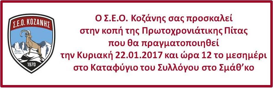 Όπως κάθε χρόνο, έτσι και φέτος, τα μέλη και οι φίλοι του Σ.Ε.Α. ΚΟΖΑΝΗΣ θα κόψουν την Πρωτοχρονιάτικη Βασιλόπιτα και θα διασκεδάσουν το Σάββατο 4 Φεβρουαρίου 2017