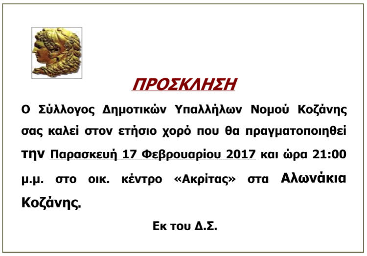 Το Δ.Σ. του παραρτήματος Κοζάνης της Ε. Μ. Ε. σας προσκαλεί την Παρασκευή 3 Φεβρουαρίου 2017 στις 9 το βράδυ στην Ταβέρνα Οινοποιόν, στην Κοζάνη (δίπλα στο Λαογραφικό Μουσείο).