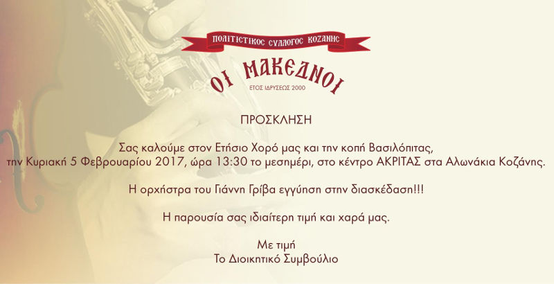 Η πρόεδρος και το Διοικητικό Συμβούλιο του Συλλόγου Κοζανιτών Θεσσαλονίκης «Ο Άγιος Νικόλαος» ευχόμαστε καλή χρονιά στα μέλη και τους φίλους του Συλλόγου και τους προσκαλούμε στο ξενοδοχείο Mediterranean Palace Hotel (Σαλαμίνος 3, Θεσσαλονίκη) το Σάββατο, 11 Φεβρουαρίου 2017,  στις 8.00 το βράδυ, στην εορταστική εκδήλωση για την κοπή της βασιλόπιτας.