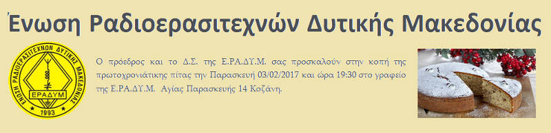 Ο Πρόεδρος και τα Μέλη της Διοικούσας Επιτροπής του Περιφερειακού Παραρτήματος Δυτικής Μακεδονίας του Γεωτεχνικού Επιμελητηρίου Ελλάδας (ΓΕΩΤ.Ε.Ε./Π.Δ.Μ.) προσκαλούν τους συναδέλφους Γεωτεχνικούς της Δυτικής Μακεδονίας και τους φίλους του Επιμελητηρίου, στην ετήσια εκδήλωση – κοπή της πρωτοχρονιάτικης πίτας, που θα πραγματοποιηθεί την Κυριακή 29 Ιανουαρίου 2017 και ώρα 12:00 στο Ξενοδοχείο ΑΛΙΑΚΜΩΝ (ισόγεια αίθουσα) στην Κοζάνη.
