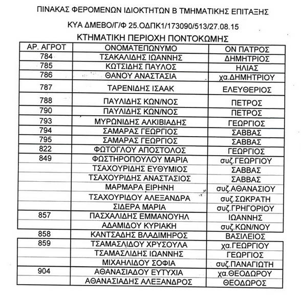 pontokomi45645Καλούμε τους κατόχους των αγρών όπως φαίνονται στο συνημμένο πίνακα Κτηματικής Περιοχής ΤΚ Ποντοκώμης Δήμου Κοζάνης, όπως προσέλθουν στο κτήριο του Διοικητηρίου του ΛΚΔΜ, στις 24, ή 25, ή 26 Ιανουαρίου 2017, προκειμένου να τους καταβληθούν οι αποζημιώσεις που καθόρισε η Επιτροπή Προεκτίμησης για τη στέρηση χρήσης επιτασσόμενων εκτάσεων 1.141.519,22τ.μ. στις Τ.Κ. Μαυροπηγής και Κομάνου του Δήμου Εορδαίας και Ποντοκώμης του Δήμου Κοζάνης βάσει της ΚΥΑ με αρ. ΔΜΕΒΟ/Γ/Φ25ΟΔΠΚ1/173090/513/27.08.2015, στα πλαίσια της απαλλοτρίωσης ΟΔΠΚ-1, που έχει κηρυχθεί με την υπ’ αριθ. Δ9/Δ/Φ53/9455/2442/2-9-14 απόφαση Υφυπουργού Περιβάλλοντος, Ενέργειας και Κλιματικής Αλλαγής (ΦΕΚ/ΑΑΠ/294/8-9-14).