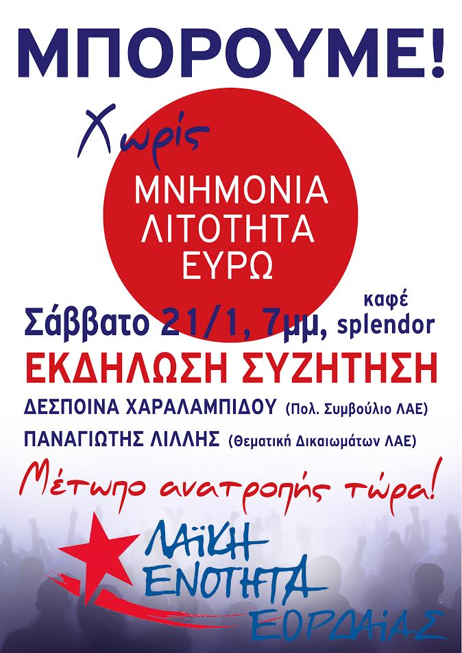 Η ΛΑΕ σας προσκαλεί στην εκδήλωση που διοργανώνει για τις πολιτικές εξελίξεις, και σε συζήτηση με ενεργούς αγωνιστές και αγωνίστριες της Αριστεράς και του αντιμνημονιακού κινήματος: