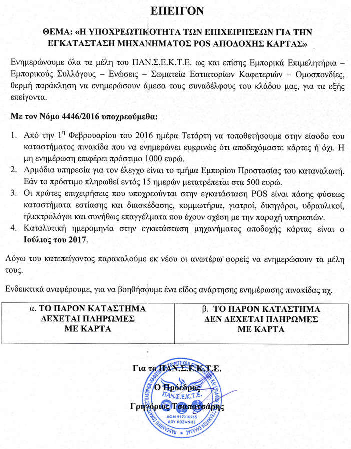 Ελλάδα 30/01/2017 Ανακοίνωση του Πανελλήνιου Σωματείου Εστιατορίων – Καφετεριών για την υποχρεωτικότητα εγκατάστασης μηχανήματος Pos στα καταστήματα 1 Ανακοίνωση του Πανελλήνιου Σωματείου Εστιατορίων – Καφετεριών για την υποχρεωτικότητα εγκατάστασης μηχανήματος Pos στα καταστήματα
