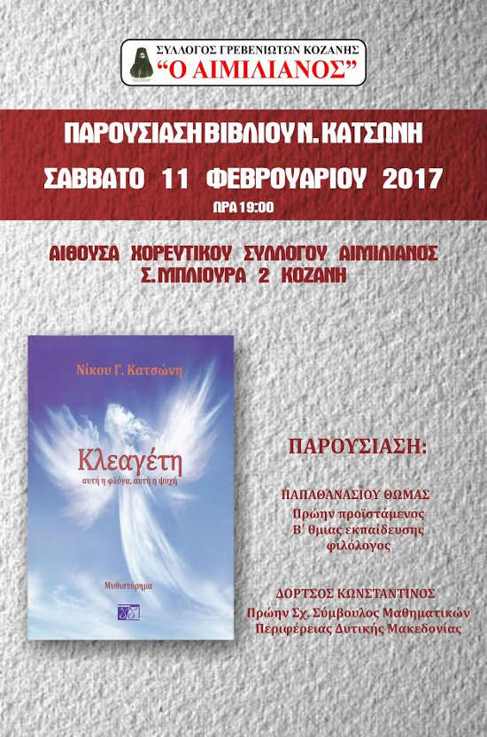Ο Σύλλογος Γρεβενιωτών Κοζάνης “Ο ΑΙΜΙΛΙΑΝΟΣ” σας προσκαλεί στην παρουσίαση του βιβλίου του Συμπατριώτη μας Νίκου Κατσώνη “Κλεαγέτη” αυτή η φλόγα αυτή η ψυχή που θα πραγματοποιηθεί το Σάββατο 11 Φεβ/ρίου 2017, στις 7 μ.μ στην αίθουσα εκδηλώσεων του Συλλόγου μας Σ. Μπλιούρα 2 εναντι Αγ Νικολάου.
