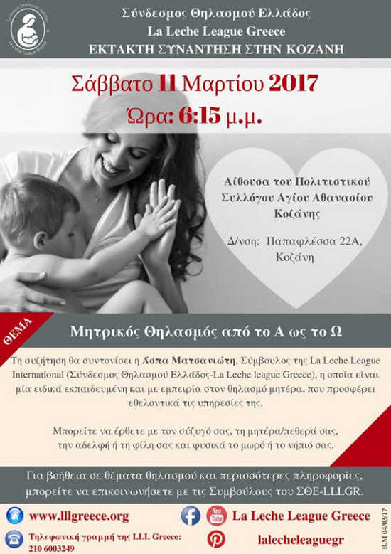 Η Εθελοντική Ομάδα Υποστήριξης Μητρικού Θηλασμού και Μητρότητας Κοζάνης (μέλος του Πανελλήνιου δικτύου ομάδων Μητρικού Θηλασμού), σας προσκαλεί σε μία έκτακτη συνάντηση του ΣΘΕ-LLL, το Σάββατο 11 Μαρτίου στις 6:15 μ.μ.