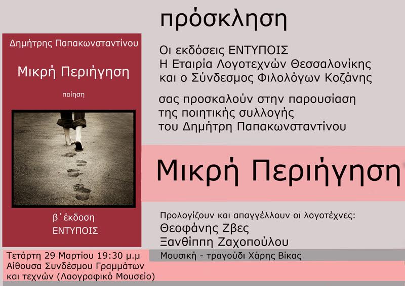 Οι εκδόσεις ΕΝΤΥΠΟΙΣ, η Εταιρία Λογοτεχνών Θεσσαλονίκης και ο Σύνδεσμος Φιλολόγων νομού Κοζάνης, σας προσκαλούν στην παρουσίαση της ποιητικής συλλογής του Δημήτρη Παπακωνσταντίνου “Μικρή Περιήγηση”.