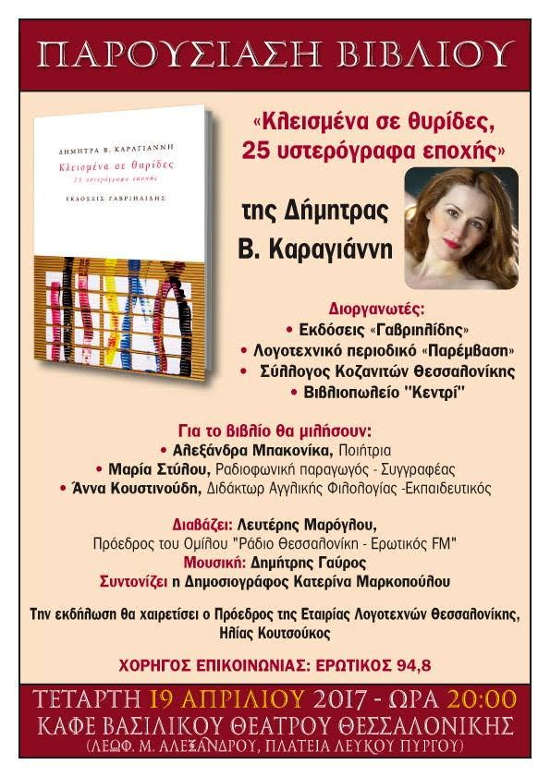 Την Τετάρτη 19 Απριλίου 2017, ώρα 8 μ.μ., στο καφέ του Βασιλικού Θεάτρου Θεσσαλονίκης (Λεωφ. Μ. Αλεξάνδρου, Πλατεία Λευκού Πύργου), θα πραγματοποιηθεί η παρουσίαση του βιβλίου «Κλεισμένα σε θυρίδες, 25 υστερόγραφα εποχής» της Δήμητρας Β. Καραγιάννη.