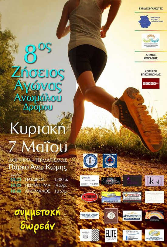 Αθλητικά 23/04/2017 Ο 8ος Ζήσειος αγώνας ανωμάλου δρόμου στην Άνω Κώμη 0 Ο 8ος Ζήσειος αγώνας ανωμάλου δρόμου στην Άνω Κώμη θα πραγματοποιηθεί την Κυριακή 7 Μαΐου 2017 με αφετηρία και τερματισμό το πάρκο της Άνω Κώμης.