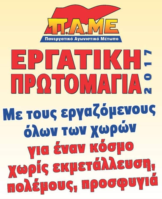 Τα συνδικάτα, οι επιτροπές αγώνα και οι αγωνιστές συνδικαλιστές που συσπειρώνονται στο ΠΑΜΕ τιμούμε την πρωτομαγιά δυναμώνοντας την πάλη μας ενάντια στον ιμπεριαλιστικό πόλεμο. Καλούμε τα συνδικάτα, όλους τους εργαζόμενους, τη νεολαία να απαιτήσουμε: