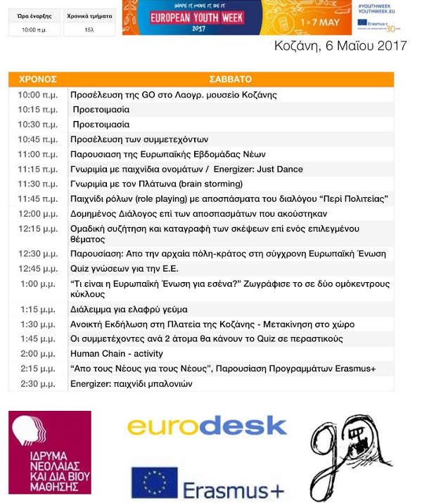 Τότε, έλα στην Κοζάνη το Σάββατο 6/5, 11.00 με 15.00 και πάρε μέρος στις δράσεις μας στα πλαίσια της Ευρωπαϊκής Εβδομάδας Νέων!
