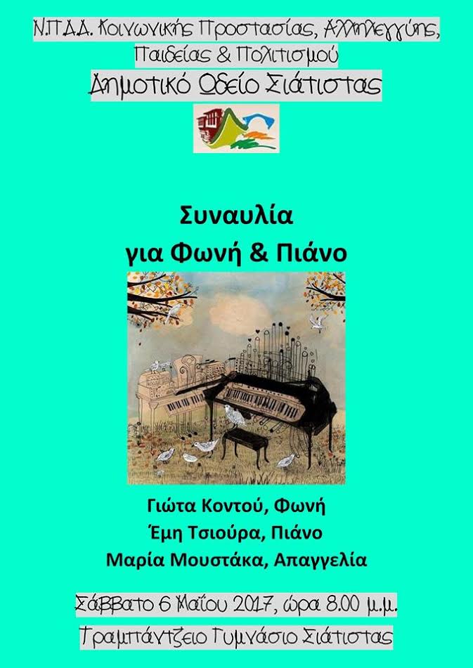 Το Ν.Π.Δ.Δ. Δήμου Βοΐου και το Δημοτικό Ωδείο Σιάτιστας σας προσκαλεί στη συναυλία για Φωνή και Πιάνο το Σάββατο 6 Μαΐου 2017. Οι πρωταγωνίστριες της εκδήλωσής μας θα είναι στο τραγούδι η Γιώτα Κοντού, στο πιάνο η Έμη Τσιούρα και στην απαγγελία στίχων η Μαρία Μουστάκα. Η συναυλία μας θα πραγματοποιηθεί στο Τραμπάντζειο Γυμνάσιο Σιάτιστας στις 20:00.