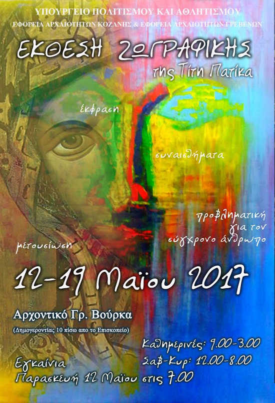 Η Εφορεία Αρχαιοτήτων Κοζάνης, στο πλαίσιο της εκδήλωσης που εγκαινίασε πέρσι, στις αρχές του 2016, υπό τον γενικό τίτλο «Η καλλιτεχνική έκφραση στο νομό Κοζάνης», με στόχο να παράσχει στήριξη και χώρο έκφρασης και έκθεσης σε παλιούς και νέους καλλιτέχνες του νομού, συνδιοργανώνει με την Εφορεία Αρχαιοτήτων Γρεβενών, έκθεση έργων ζωγραφικής της Τίτης Πατίκα.