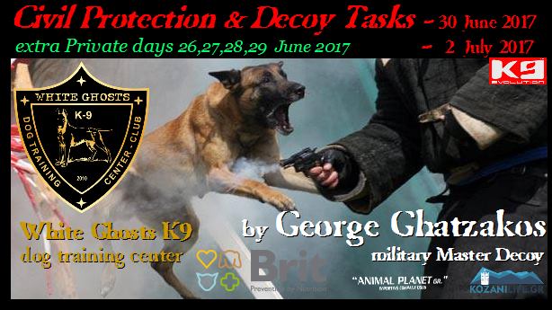 Ο Κυναθλητικός Όμιλος White Ghosts DSC σε συνεργασία με το Κέντρο Εκπαίδευσης Σκύλων White Ghosts K9 διοργανώνει Τριήμερο σεμινάριο / εργαστήρι στις 30 Ιουνίου 2017 ως τις 2 Ιουλίου 2017 και έξτρα ιδιωτικές μέρες εκπαίδευσης για τους ενδιαφερόμενους στις 26,27,28,29 Ιουνίου 2017 με θέμα: