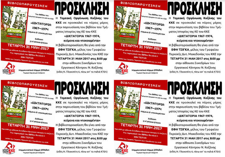 Η Τομεακή Οργάνωση Κοζάνης του ΚΚΕ σε προσκαλεί να πάρεις μέρος στην παρουσίαση του βιβλίου του Τμήματος Ιστορίας της ΚΕ του ΚΚΕ «ΔΙΚΤΑΤΟΡΙΑ 1967-1974, κείμενα και ντοκουμέντα».