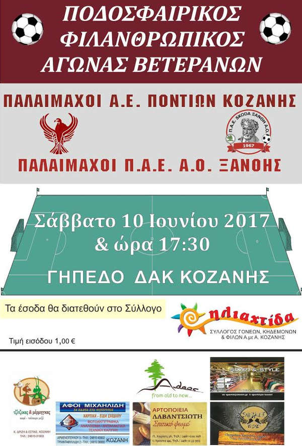 Ποδοσφαιρικός Φιλανθρωπικός αγώνας Βετεράνων θα πραγματοποιηθεί το Σάββατο 10 Ιουνίου στο ΔΑΚ Κοζάνης.