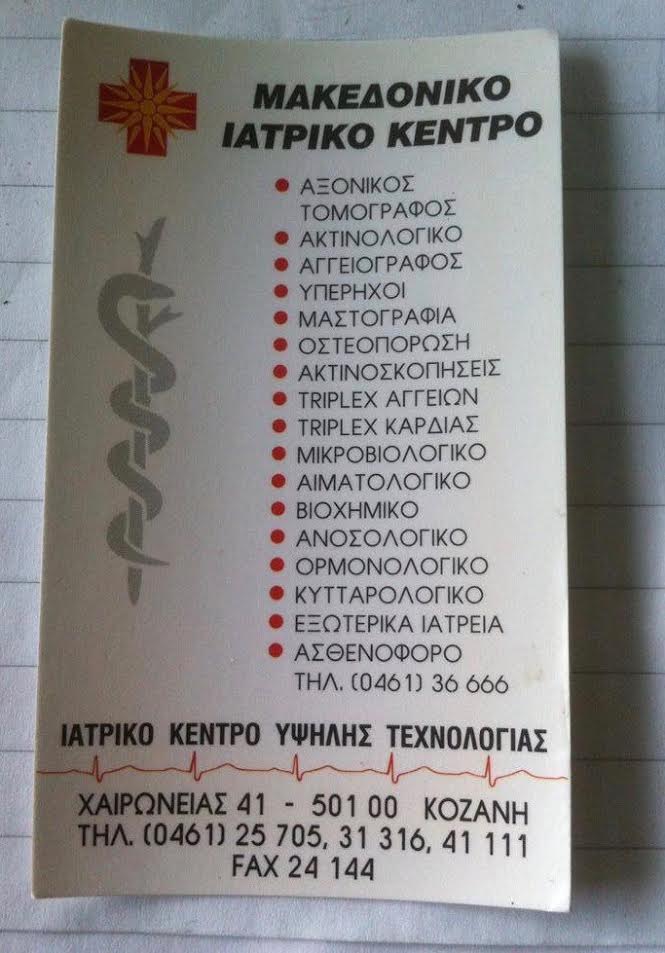 Χαρακτηριστική είναι και η κάρτα του Μακεδονικού Ιατρικού Κέντρου με τις υπηρεσίες που παρείχε: