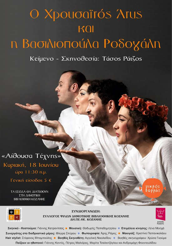 Ο Σύλλογος Φίλων Δημοτικής Βιβλιοθήκης Κοζάνης σε συνεργασία με το ΔΗ.ΠΕ.ΘΕ. Κοζάνης σας προσκαλούν στην παιδική παράσταση «Ο Χρυσαετός Άτυς και η Βασιλοπούλα Ροδογάλη» την Κυριακή 18 Ιουνίου 2017 και ώρα 11:30, στην Αίθουσα Τέχνης Κοζάνης.
