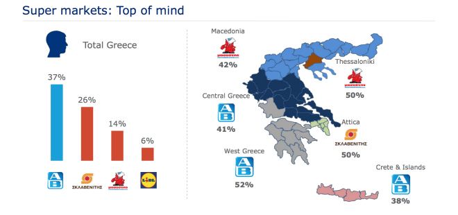 Όπως φαίνεται και στον χάρτη της Ελλάδας την θέση της “πρώτης επιλογής”, που στο παρελθόν κυριαρχούσε η Carrefour Μαρινόπουλος, πλέον από την Κεντρική Ελλάδα και κάτω έχει πάρει η ΑΒ Βασιλόπουλος. Αντίθετα “κυβέρνηση και με απλή αναλογική σχηματίζουν” σε Αττική η Σκλαβενίτης και στην Θεσσαλονίκη η Μασούτης η οποία διατηρεί ένα πολύ υψηλό ποσοστό και σε όλη την Μακεδονία.