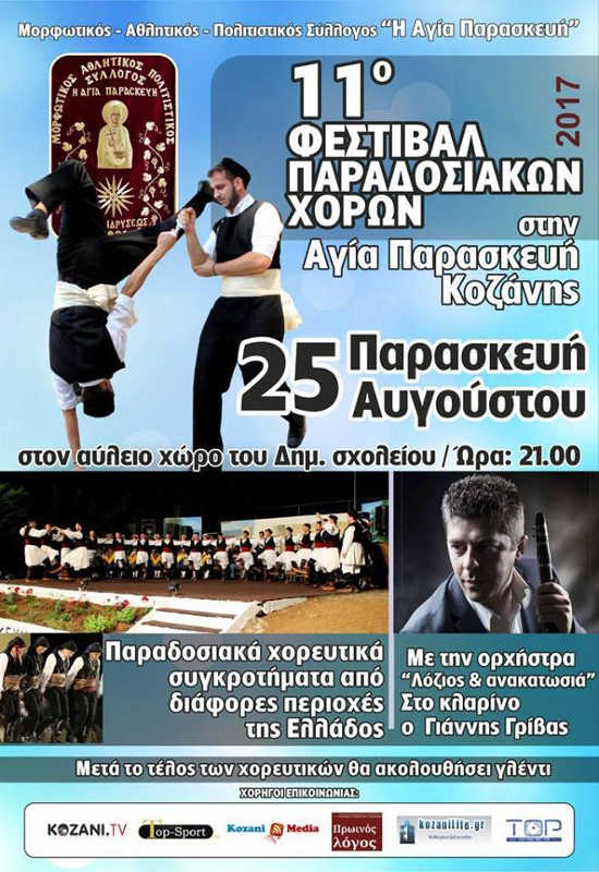Κοζάνη 25/08/2017 11ο Φεστιβάλ Παραδοσιακών Χορών στην Αγία Παρασκευή Κοζάνης 0 Το 11ο Φεστιβάλ Παραδοσιακών Χορών στην Αγία Παρασκευή Κοζάνης θα πραγματοποιηθεί το Σάββατο 25 Αυγούστου 2017. Συγκεκριμένα, θα γίνει παρουσίαση χορευτικών από διάφορες περιοχές και στη συνέχεια γλέντι με την ορχήστρα του Γιάννη Γρίβα.