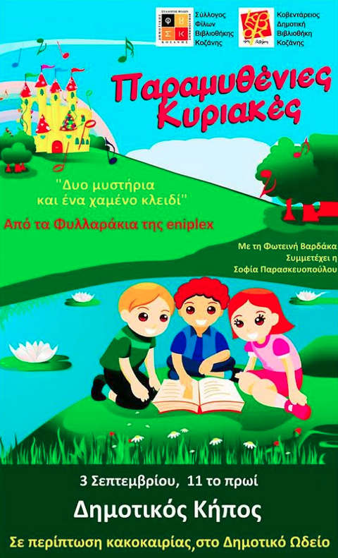 Στην τέταρτη «Παραμυθένια Κυριακή» του φετινού καλοκαιριού θα υποδεχτούμε τη Φωτεινή Βαρδάκα και τη Σοφία Παρασκευοπούλου, που θα ερευνήσουν μαζί με τους μικρούς μας φίλους, δυο μυστήρια ψάχνοντας το χαμένο κλειδί”.