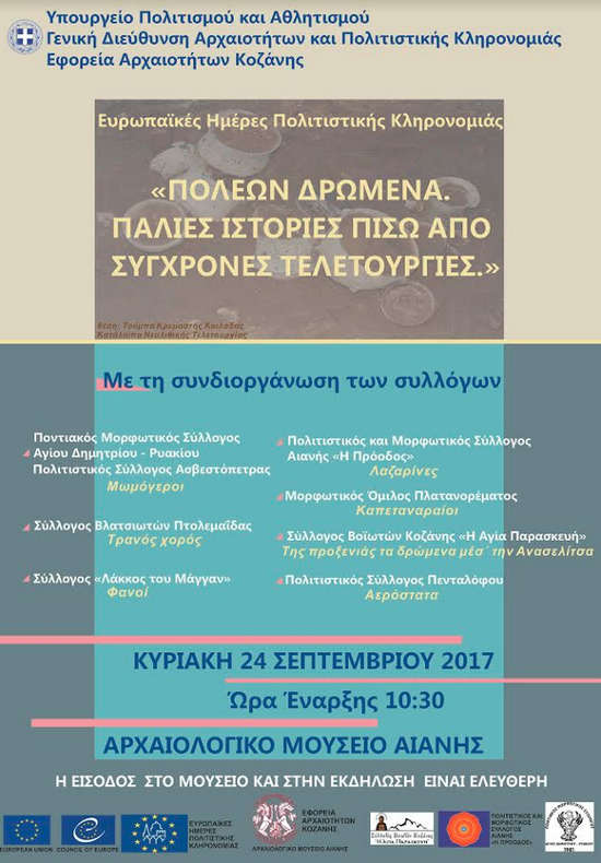 Η εκδήλωση θα πραγματοποιηθεί την Κυριακή 24 Σεπτεμβρίου 2017, κατά τις ώρες 10.30 έως 15.00, στο Αρχαιολογικό Μουσείο Αιανής.