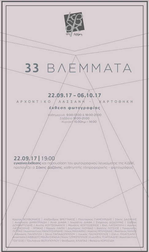 Η Κοβεντάρειος Δημοτική Βιβλιοθήκη Κοζάνης, στο πλαίσιο στήριξης και ανάδειξης του πολιτισμού και των τεχνών, εξέδωσε ένα πλούσιο φωτογραφικό λεύκωμα και οργανώνει έκθεση Φωτογραφιών των φωτογράφων που συμμετείχαν στο λεύκωμα, με τίτλο “33 Βλέμματα”.