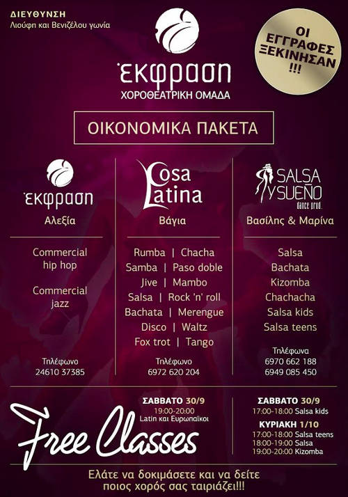 Τμήματα προχωρημένων και αρχαρίων, παιδικά, εφηβικά και ενηλίκων, μας περιμένουν όλα στον χώρο της χοροθεατρικής ομάδας ΕΚΦΡΑΣΗ, Λιούφη και Βενιζέλου γωνία, για να ικανοποιήσουν κάθε γούστο. Salsa-bachata, Kizomba, Latin International & American style, Eυρωπαϊκοί χοροί, Commercial jazz, Commercial hip hop, Mπαλέτο προσφέρονται σε οικονομικά πακέτα και προσιτές τιμές.