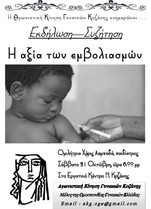 Σας προσκαλούμε στην εκδήλωση, που διοργανώνει η Αγωνιστική Κίνηση Γυναικών Κοζάνης, με θέμα «Η αξία των εμβολιασμών», το Σάββατο 21 Οκτώβρη, στις 6:00μμ, στο Εργατικό Κέντρο Ν. Κοζάνης