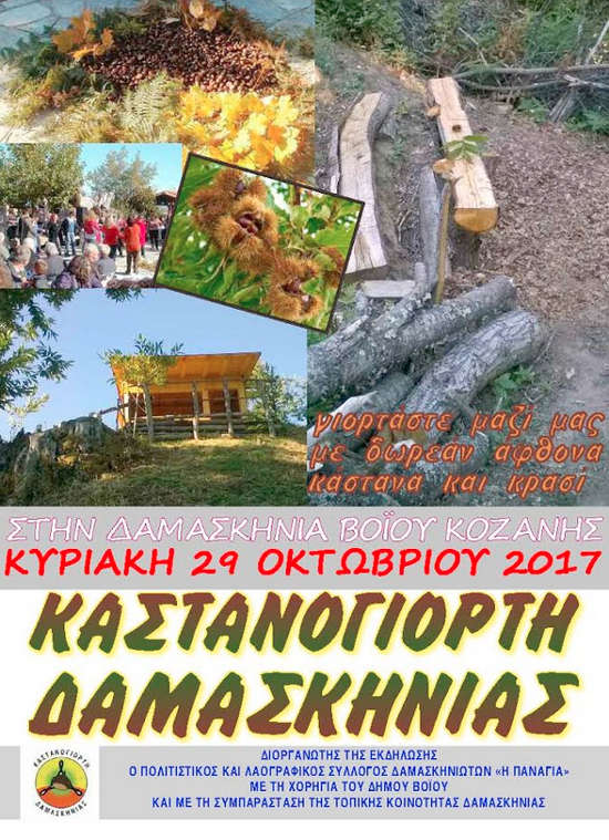 Βόιο 16/10/2017 Στις 29 Οκτωβρίου η φετινή Καστανογιορτή στη Δαμασκηνιά Βοΐου 0 Στις 29 Οκτωβρίου η φετινή Καστανογιορτή στη Δαμασκηνιά Βοΐου