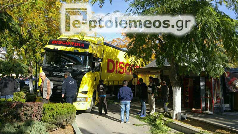 Τρίτη ώρα 9.30 το πρωί, τεράστιο φορτηγό με Βουλγαρικές πινακίδες, εισήλθε στην πόλη, χωρίς να δει την πινακίδα για να φύγει από την περιφερειακή οδό. Όπως ήταν φυσικό ‘’κόλλησε’’ μέσα στις νησίδες, δημιούργησε ζημίες στα δένδρα και έκλεισε το δεξιό ρεύμα προς Υδραγωγείο.