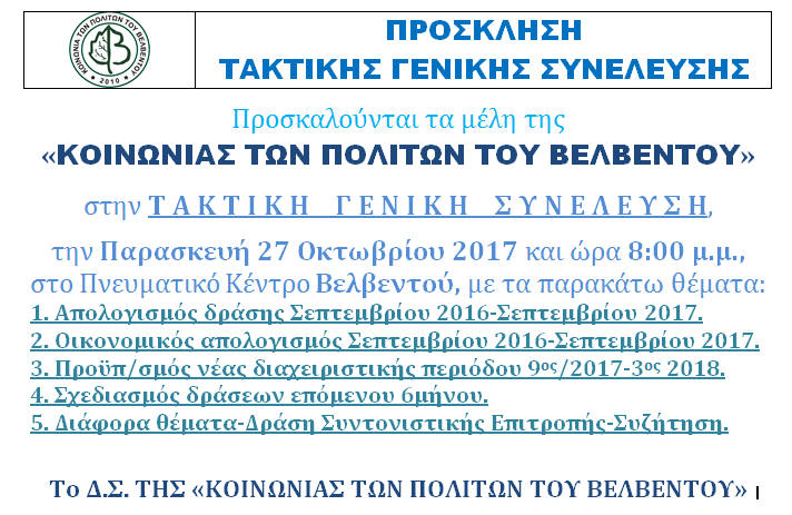 Σέρβια - Βελβεντό 23/10/2017 Τακτική Γενική Συνέλευση της Κοινωνίας των Πολιτών του Βελβεντού 0 Τακτική Γενική Συνέλευση της Κοινωνίας των Πολιτών του Βελβεντού