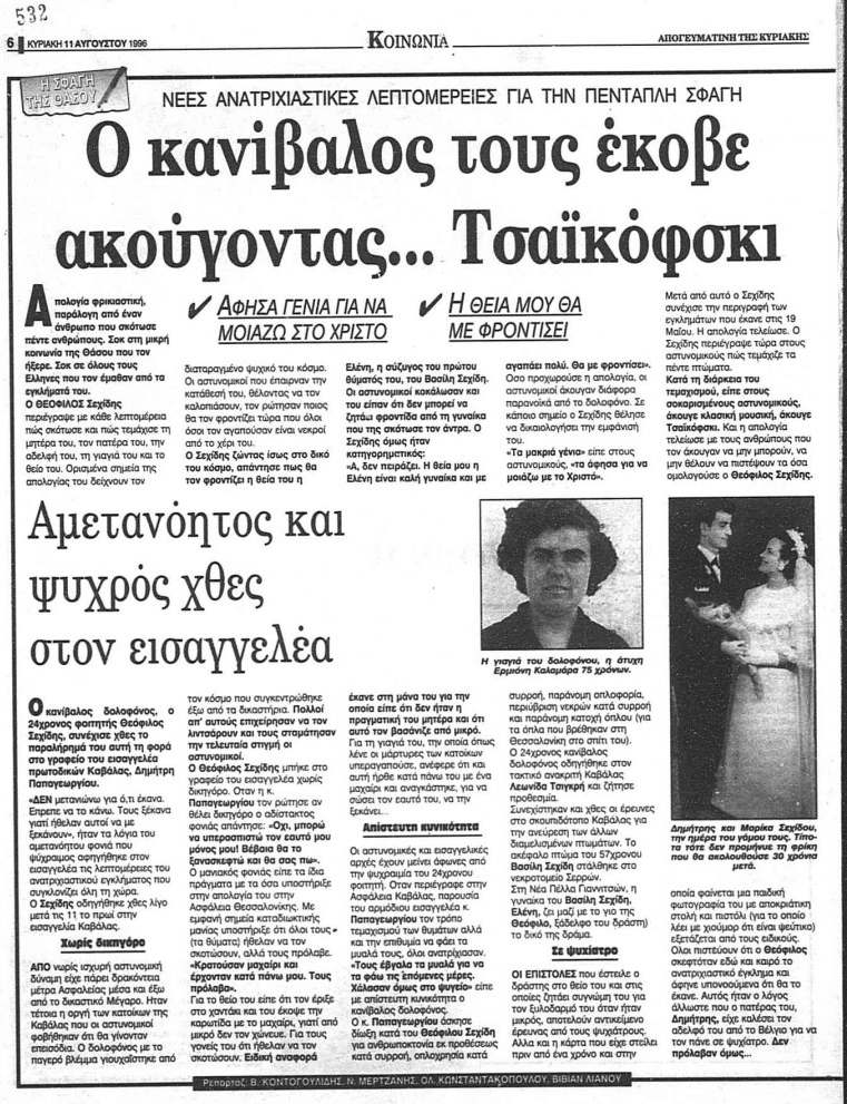 Ο Θεόφιλος Σεχίδης διέπραξε ένα έγκλημα που αδυνατεί, ακόμη και τώρα, να το συλλάβει ο ανθρώπινος νους. Ο 24χρονος δολοφόνησε όλη του την οικογένεια στη Θάσο το Μάιο του 1996. Οι δολοφονίες αποκαλύφθηκαν τον Αύγουστο του ίδιου έτους, δηλαδή δυόμισι μήνες αργότερα ύστερα από καταγγελία για εξαφάνιση των θυμάτων.