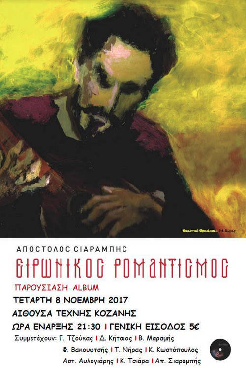 888hkufdtkuydtkuydtktΟ Αποστόλης Σιαραμπής παρουσιάζει την πρώτη του δισκογραφική δουλειά με τίτλο ‘Ειρωνικός Ρομαντισμός’ στην Αίθουσα Τέχνης Κοζάνης την Τετάρτη 8 Νοεμβρίου 2017 & ώρα 21:30. Γενική είσοδος 5 €.