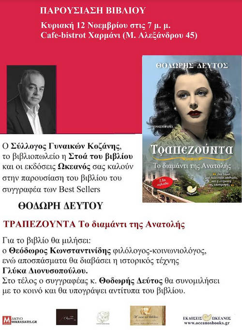 Ο Σύλλογος Γυναικών Κοζάνης, το βιβλιοπωλείο η Στοά του βιβλίου και οι εκδόσεις Ωκεανός σας προσκαλούν στην παρουσίαση του βιβλίου “Τραπεζούντα, Το διαμάντι της Ανατολής” του Θοδωρή Δεύτου που θα πραγματοποιηθεί την Κυριακή 12 Νοεμβρλιου στις 7μ.μ. στο cafe-bistrot Χαρμάνι (Μ.Αλεξάνδρου 45).