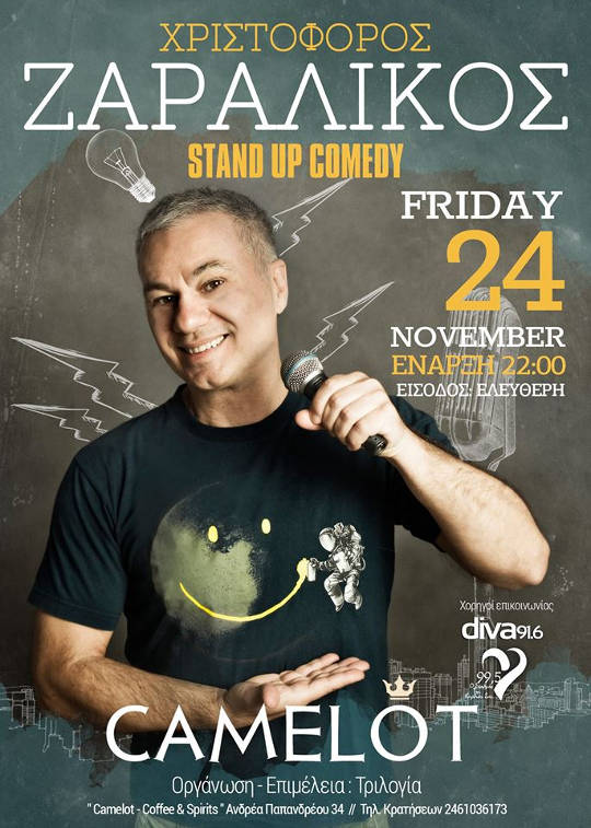 Ο «όρθιος κωμικός» Χριστόφορος Ζαραλίκος ξαναχτυπά στην Κοζάνη! Αφήνει για λίγο τις παραστάσεις του στην πρωτεύουσα και προσγειώνεται την Παρασκευή 24 Νοεμβρίου στο Camelot με ένα σοβιετικό MIG-16. Σατιρίζει την φαιδρή πλευρά της καθημερινότητας, «παίζει» με το κοινό και ως γνήσιο πειραχτήρι δεν αφήνει τίποτα ασχολίαστο!