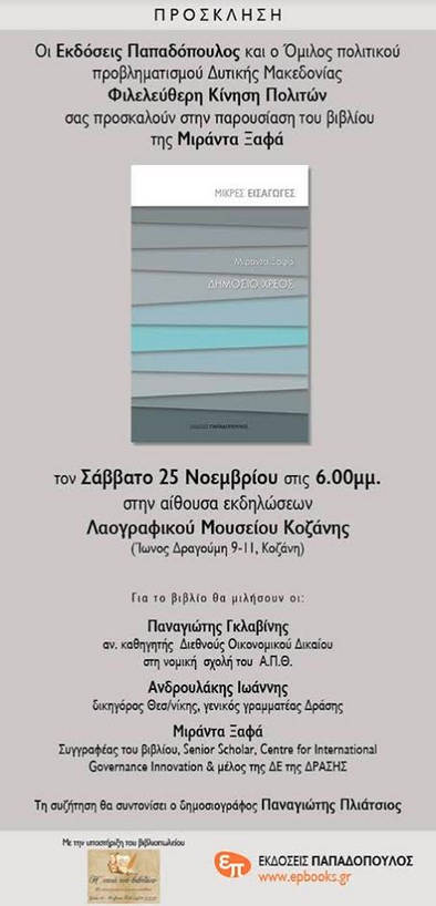 Σας προσκαλούμε το Σάββατο 25 Νοεμβρίου 2017 και ώρα 18:00, στην αίθουσα εκδηλώσεων του Λαογραφικού Μουσείου Κοζάνης (Ίωνος Δραγούμη 9-11, Κοζάνη), όπου ο όμιλος πολιτικού προβληματισμού “Φιλελεύθερη Κίνηση Πολιτών” σε συνεργασία με τον εκδοτικό οίκο “Εκδόσεις Παπαδόπουλος” διοργανώνουν εκδήλωση για την παρουσίαση του βιβλίου της κυρίας Μιράντας Ξαφά με τίτλο “Δημόσιο Χρέος”.