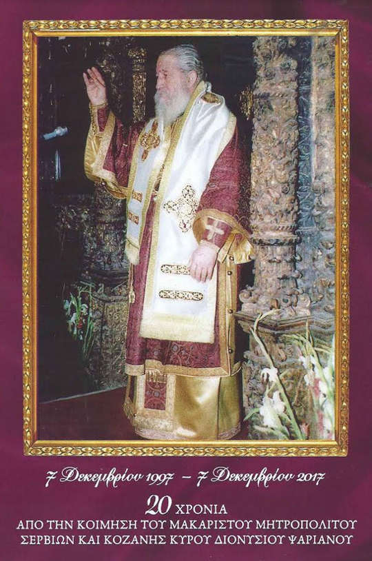 Ντυμένος με τα αρχιερατικά του άμφια, όρθιος και μπροστά στην Ωραία Πύλη του Ιερού Μητροπολιτικού Ναού Αγίου Νικολάου Κοζάνης, με ανασηκωμένο το δεξί του χέρι έτσι που να ευλογεί το λαό, ο μακαριστός Μητροπολίτης Σερβίων και Κοζάνης κυρός Διονύσιος Ψαριανός, δεσπόζει στο καλαίσθητο – ιεροπρεπές δίπτυχο – αφιέρωμα της Ιεράς Μητροπόλεως Σερβίων και Κοζάνης για τα ‘’20 χρόνια από την κοίμηση του μακαριστού Μητροπολίτου Σερβίων και Κοζάνης κυρού ΔΙΟΝΥΣΙΟΥ ΨΑΡΙΑΝΟΥ, 7 Δεκεμβρίου 1997 – 7 Δεκεμβρίου 2017’’, που μας έστειλε η Ιερά Μητρόπολις Σερβίων και Κοζάνης για να το μοιράσουμε στο εκκλησίασμα.