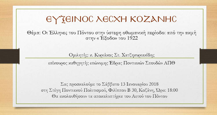 Το Διοικητικό Συμβούλιο της Ευξείνου Λέσχης Κοζάνης καλεί τα μέλη και τους φίλους του Συλλόγου, το Σάββατο 13 Ιανουαρίου 2018, στις 18:00, στη Στέγη Ποντιακού Πολιτισμού (Φιλίππου Β 30), όπου θα πραγματοποιηθεί διάλεξη από τον κ. Κυριάκο Στ. Χατζηκυριακίδη, επίκουρο καθηγητή επώνυμης Έδρας Ποντιακών Σπουδών του ΑΠΘ.