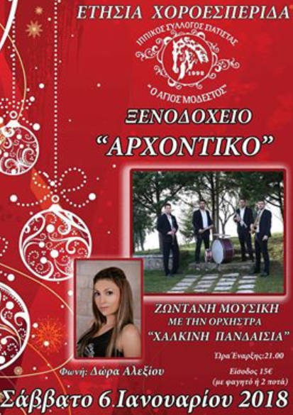 Το Δ.Σ. του Ιππικού Αθλητικού Πολιτιστικού Συλλόγου Σιάτιστας «Άγιος Μόδεστος», σας εύχεται Χρόνια Πολλά & Ευτυχισμένο το Νέο Έτος και σας προσκαλεί στην “Ετήσια Χοροεσπερίδα” του, το Σάββατο 6 Ιανουαρίου 2018 και ώρα 21:00′, στο ξενοδοχείο «Αρχοντικό»!