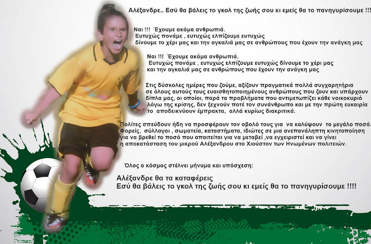 Φορείς, σύλλογοι , σωματεία, καταστήματα, ιδιώτες σε μια ανεπανάληπτη κινητοποίηση για να βρεθεί το ποσό που απαιτείται για να μεταβεί , να εγχειριστεί και να γίνει η αποκατάσταση του μικρού Αλέξανδρου στο Χιούστον των Ηνωμένων πολιτειών.